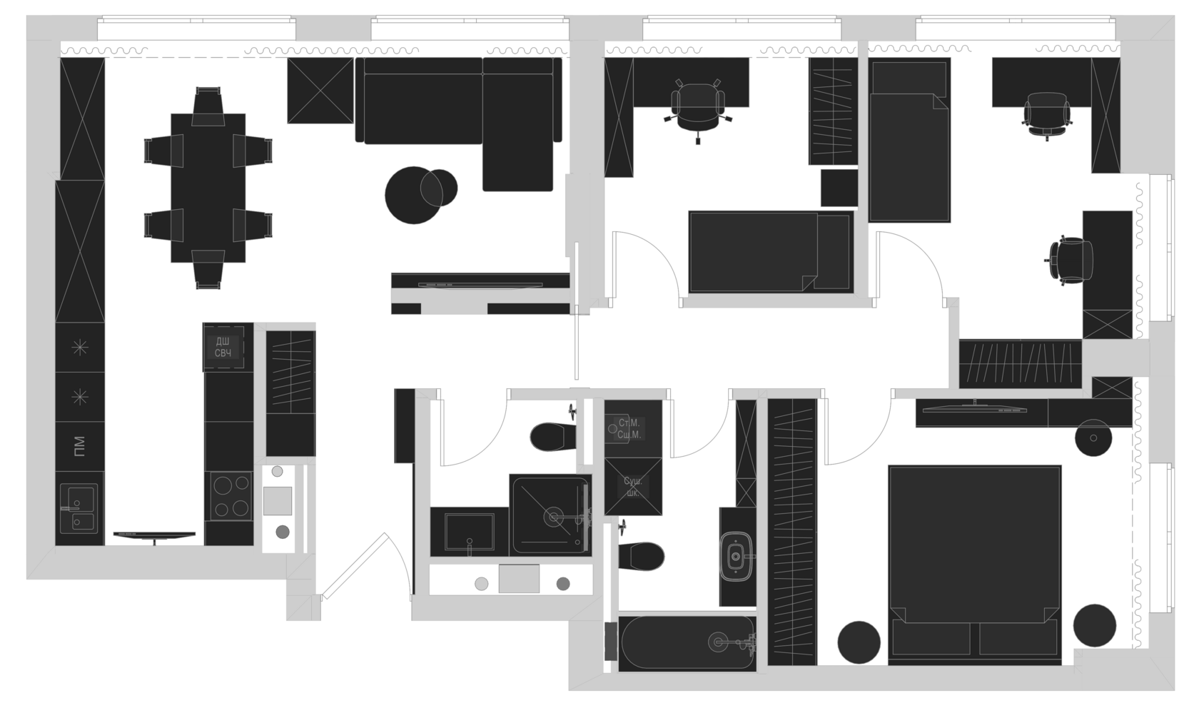 Нас ждала просторная квартира, где нужно было разместить всё необходимое для будущего комфорта: две детские на троих детей, кухню-гостиную, уютную спальню и два санузла. Однако, самый интересный момент заключался в том, что на момент начала работы не было ни детей, ни... бурундука! Да-да, заказчики попросили предусмотреть место для клетки, где, по их плану, должен поселиться будущий питомец – очаровательный бурундук.