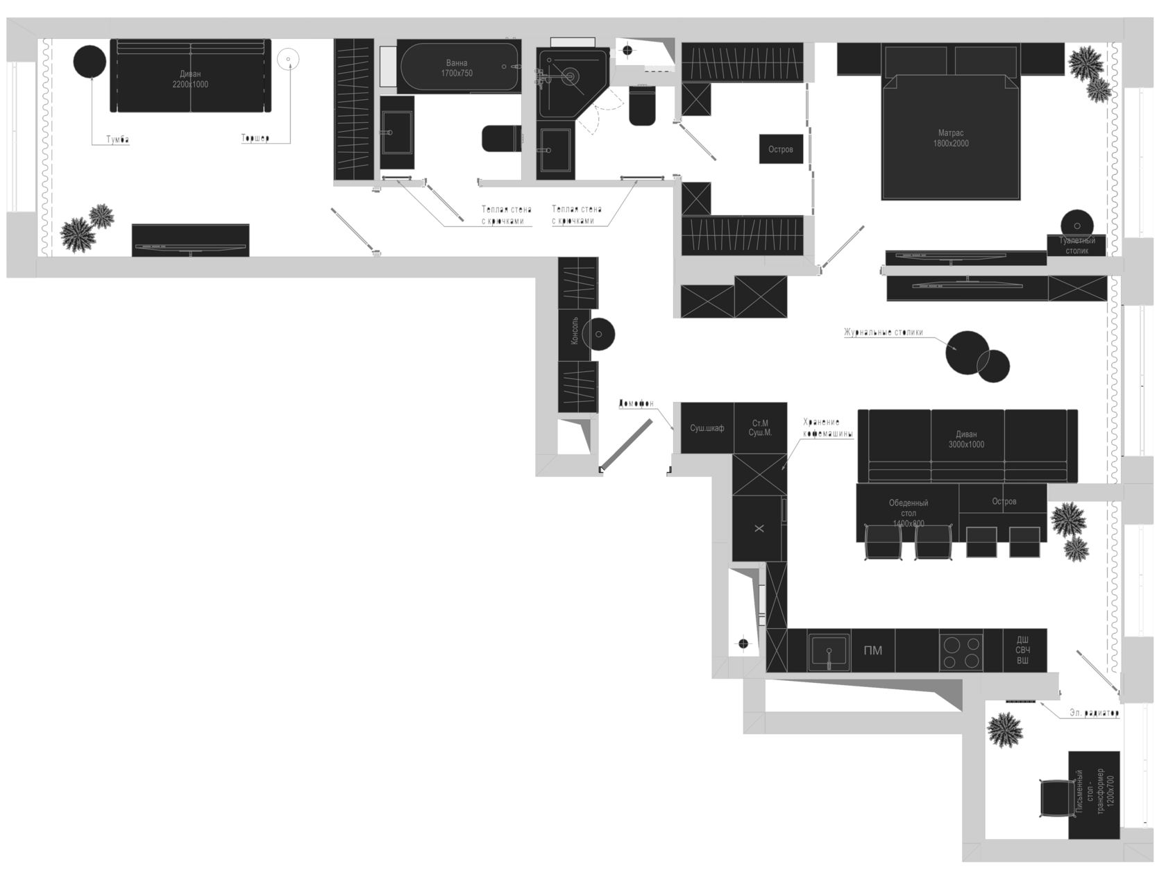 Мы решили не кардинально менять планировку: сохранили расположение стен и зонировали пространство так, чтобы оно отвечало всем потребностям. Квартира включила в себя два санузла, мастер-спальню с гардеробной и собственным санузлом, просторную кухню-гостиную, детскую, а также уютный кабинет, который мы разместили на балконе — он стал настоящим уголком для уединенной работы или творчества.